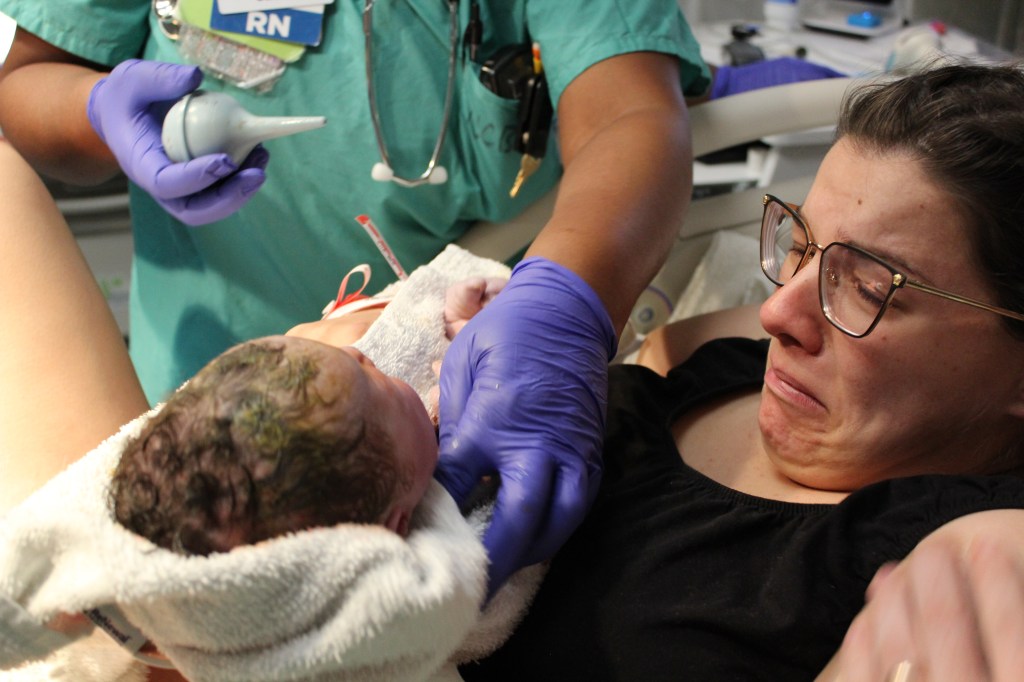 Looking back, there were so many graces and blessings during Victoria’s birth. Deciding to wait for the OB was one of them. When she finally arrived, almost 45 minutes later, the baby had descended to the point that Emily was able to push her out in less than an hour. The look of pure joy and satisfaction as my baby held her baby, was priceless. The extra IV port and the OB’s quick action right after delivery of the placenta was also a blessing. Emily had excessive bleeding and nearly needed a blood transfusion. Thankfully, she recovered quickly, but they left both IV’s in until the next day, just in case.